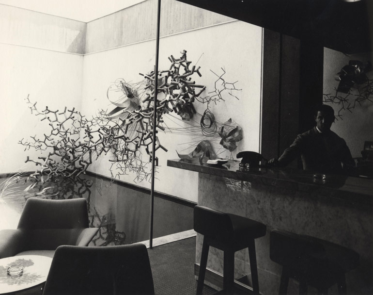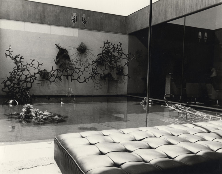Brass, bronze and copper sculpture Written on back of photo: “View from main lobby into glass enclosed reflecting pool 25’ x 21’. Sculpture extends into bar on right and total length of sculpture is 33’”