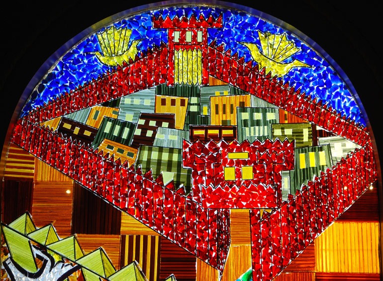 ”SAMSON WALKING OFF WITH THE TOWN GATES IN GAZA’: Stained glass window.
